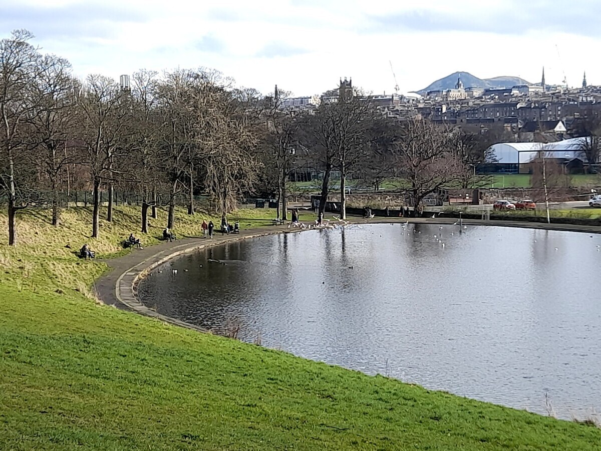 Inverleith Park lies north of the city centre and is one of Edinburgh's largest open green spaces. It has good views across the city centre to the Castle. The terrain is mainly grass parkland, crossed by tarmac paths lined with mature trees. It includes sports pitches, a play area, and a boating pond. There are many ducks and swans on the pond, and at the west end there is a marsh area with a wooden boardwalk providing access to view the flora and fauna, and an interpretation board.